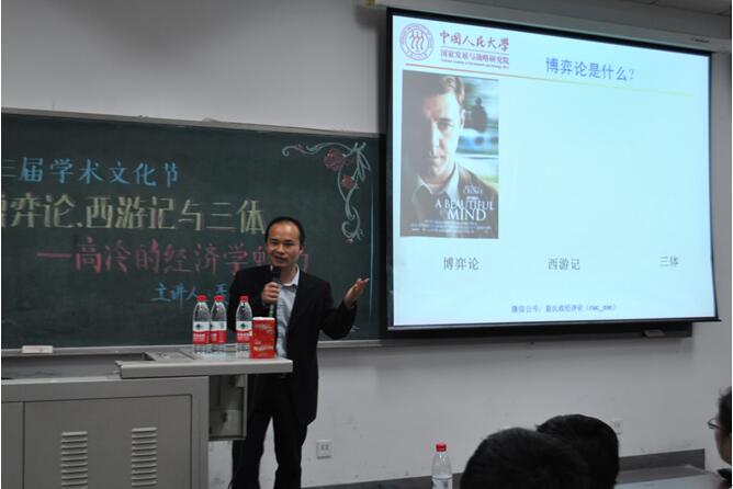 2016年5月4日星期三,在350vip浦京集团官网沙河校区主教305教室开展了“博弈论、西游记与三体—高冷的经济学魅力”的讲座。主讲人是中国人民大学经济学博士,美国哈佛大学经济学系博士后聂辉华教授。出席此次讲座的有350vip浦京集团官网党总支副书记谭小芬教授和团总支书记李菊,同学们对本次讲座充满兴趣,教室里座无虚席。