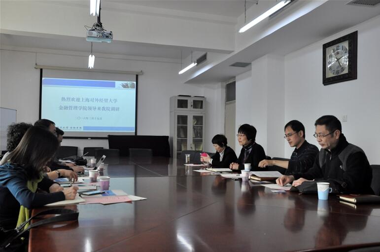 葛仁霞书记对贺学会院长一行的来访表示欢迎,介绍了学院的历史沿革,并对近年来的学院本科生、研究生两个培养层次的专业设置、师资人才引进、人才培养方面进行的创新性尝试以及学生生源质量、在校生数量及毕业生就业等基本情况做了说明。贺学会院长则就上海对外经贸大学金融管理学院的本硕专业设置、课程开设、国际项目和全英文实验班建设以及学校和学院发展面临的机遇挑战等方面进行了介绍,并指出希望两院在本科专业建设、制度建设、学术交流等方面能建立联系,长期合作,共同发展。