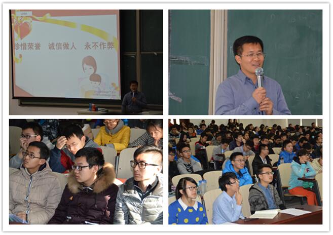 为进一步严肃考风考纪,净化考试环境,树立诚信考风,浦京集团官网于2015年12月24日在沙河校区主教学楼109教室召开沙河校区350vip浦京集团官网2015级新生考风考纪教育大会,号召全体新生“珍惜荣誉,诚信做人,永不作弊”。会议由党总支副书记谭小芬老师对新生做了详尽的阐述与讲解,大一辅导员刘勇老师、梅琪老师及2015级近240名同学参加大会。会场秩序井然,同学们以非常认真严肃的态度接受了此次考试纪律与诚信做人的规范教育。