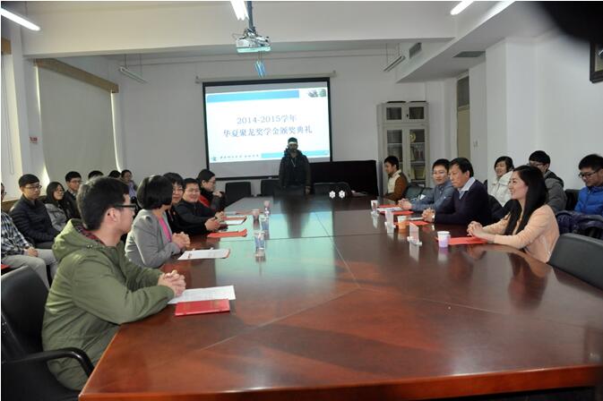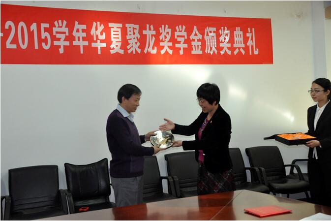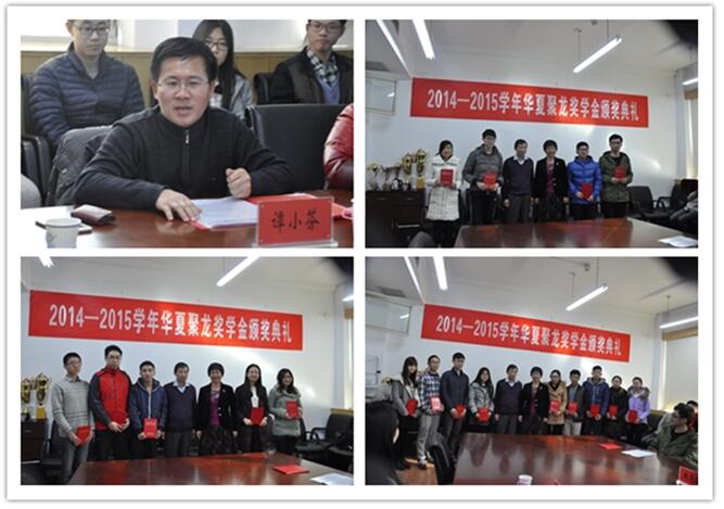 接下来,谭小芬副书记宣读《关于颁发2014-2015学年华夏聚龙奖学金的通知》,张建军总经理、葛仁霞书记共同为获奖学生颁奖并合影留念。