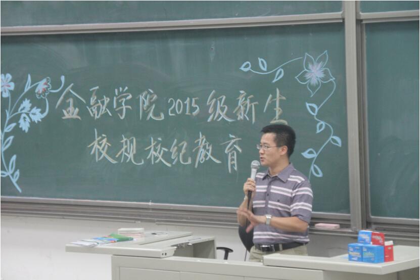 2015年9月9日下午16:10,350vip浦京集团官网党总支副书记谭小芬老师为全体2015级新生进行了校规校纪和安全教育。他首先提出安全健康是人才培养的基础,指出了安全教育的重要性;然后,他具体介绍了安全规范和校规校纪,着重强调大学考试中坚决抵制作弊行为,以及作弊行为带来的终身无法弥补的后果;接下来,他对金融行业进行了具体的分析,鼓励大家做国际化的金融人才,开阔视野,提升综合素质,在中外对比特别是中美对比中感受中国金融业的广阔未来;最后,他为同学们提出了几点建议,突出了大学时代语文数学英语学习的全新内涵。讲座中深刻的道理、朴实的话语,结合丰富生动的实际案例,让同学们在轻松的氛围中受到了良好的教育。