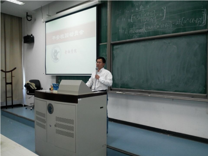谭小芬副书记首先介绍了平安校园工作的基本原则和指导思想。他提出,“平安校园”创建工作是实现学生成长和教师发展的基础和前提,她能够为金融人才的培养和成长提供安定和谐的校园环境,为学院的学科建设、科学研究、社会服务等各项事业的发展保驾护航。因此,同学们要牢记“安全第一”的指导思想,通过“平安校园”创建工作这一抓手,把安全稳定纳入到学习和各项学生活动之中,形成整体合力,切实提升安全稳定工作实效和水平,为莘莘学子们创造良好的学习环境,为促进金融理论的繁荣发展和普及应用提供坚实的保障。
