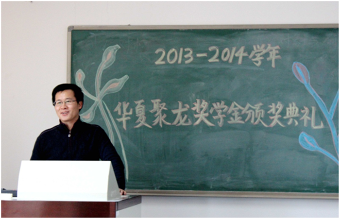 大会第三项,谭小芬副书记宣读《关于颁发2013-2014学年华夏聚龙奖学金的通知》,随后与王路女士、谭云天先生逐一为获奖学生颁奖并合影留念。