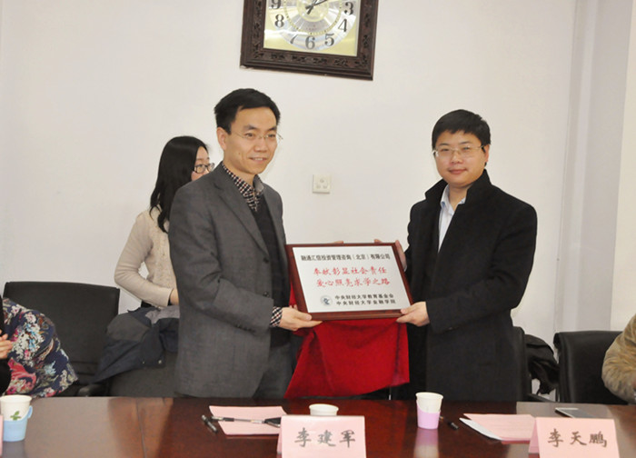 典礼最后,李建军副院长代表350vip浦京集团官网向融通汇信公司赠送了“奉献彰显社会责任,爱心照亮求学之路”的牌匾,以感谢融通汇信投资管理公司设立融信奖学金,资助家庭经济困难学生的善举。