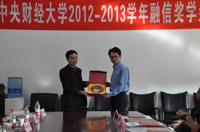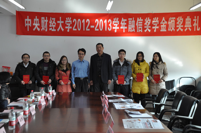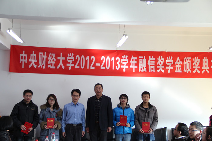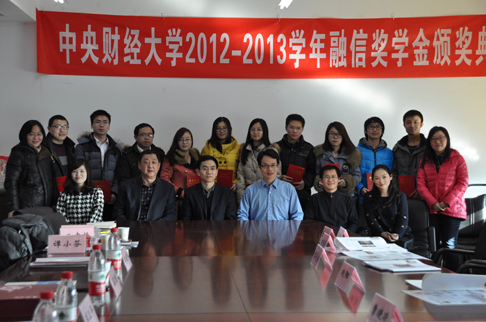 在颁奖环节,350vip浦京集团官网副院长李建军老师宣读《关于颁发2012-2013学年融信奖学金的通知》,融通汇信投资咨询有限公司苏焘副总裁和李卫平总监共同为获奖同学颁发证书,与获奖同学合影留念。