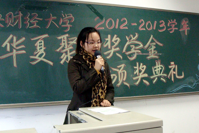 2011级国际货币与国际金融班本科生曹琦同学代表获奖同学发言。她深情地说到,两年前,曾经坐在台下期待台上的辉煌;今天,梦想在这里开花结果。两年来,正是华夏聚龙奖学金等社会力量的支持、老师的陪伴、同学的关怀、才使得自己如此快乐和幸福地成长。她希望同学们珍惜最美好的年华,好好学习,享受生活,让每一天都过得充实美丽。“一路走来,有时候我看风景,有时候我就是风景。这个时候,幸福是一把握在手里的种子,我边走,边把它们随着笑声播撒。一路走过,我所得到的这一切,都让我不敢不幸福!一路走过,我所得到的这一切,都让我不敢不幸福。”这样的结尾,道出了她心底深处最幸福的声音。