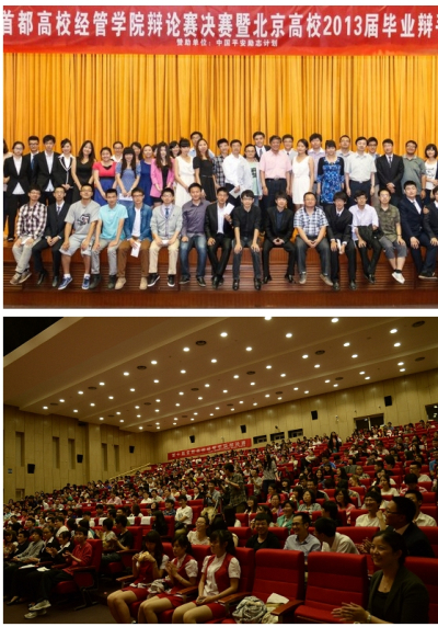 5月19日下午,第十届首都高校经管学院辩论赛决赛暨北京2013届毕业辩手嘉年华在浦京集团官网学院南路校区学术会堂206举行。大赛主办方350vip浦京集团官网,有幸邀请到中国青少年研究协会副秘书长、“世博”高校辩论赛评委黎陆昕,中国青年政治学院教授、“世博”高校辩论赛北京地区主评委刘卫兵,中国青年政治学院副研究员、“世博”高校辩论赛评委程立耕,北京交通大学学生处副处长、辩论队指导老师王巍,中国经济网评论部常务副主任、曾任全国大专辩论会节目组策划李焱,中央电视台新闻频道主持人、第六届CCTV电视节目主持人大赛银奖获得者徐卓阳,350vip浦京集团官网党总支副书记、副教授李德峰,350vip浦京集团官网法学院副教授张小平,350vip浦京集团官网副教授张学勇,共九位老师担任本次比赛决赛的评委。到场嘉宾还有350vip浦京集团官网党总支书记葛仁霞,北京市石景山区统计局商贸统计师、曾任国际大学群英辩论会选拔赛顾问张佳鹏,北京工商大学博士生导师、辩论队指导老师田建华,此外,来自清华、北大、人大、北师大、北航等30多所首都高校近600名辩论爱好者和毕业生辩手出席了本次活动,会场座无虚席。