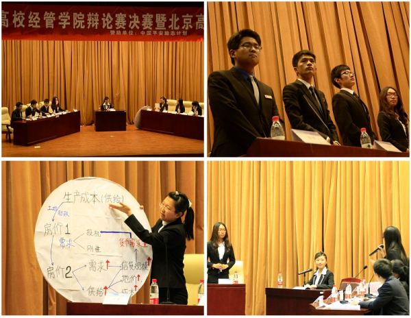 之后,第十届首都高校经管学院辩论赛决赛正式开始,辩论主题紧紧围绕当前国计民生的热点问题 “货币超发是不是房价大涨的主要原因”。正方中国传媒大学经济与管理学院持观点“货币超发是房价大涨的主要原因”,其一辩清晰流畅的开篇立论博得了观众的热烈掌声;而反方也毫不示弱,一辩用一幅示意图向全场观众展示了房价大涨的缘由,别出心裁。随后比赛变得更加激烈,双方辩手唇枪舌战,你来我往。正方从货币超发引起投资需求增加、土地价格上升导致房价大涨的角度系统地对命题进行了论证,同时引出多个专业模型和实例作证,可谓准备充分,论据充实。反方也表现出色,不仅对对手“主要原因即影响最广泛深远的原因”的观点提出质疑,对其过于片面的看法进行驳斥,还用ADF模型、经济机制中环环相扣对房价促涨的影响等观点成功捍卫了自己的观点。