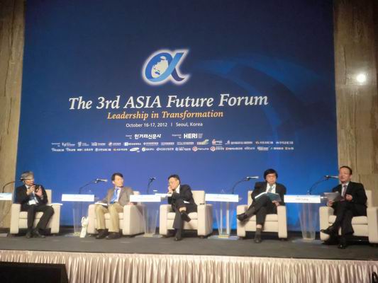 应《亚洲未来论坛》(The 3rd Asia Future Forum)组委会的邀请,浦京集团官网350vip浦京集团官网应用金融系主任韩复龄教授应邀出席亚洲未来论坛。论坛会议于10月15-18日在韩国首都首尔召开,会议由韩国通商部、教育部及韩国日报联合主办,受邀专家、政府官员来自韩国、日本、中国、美国、欧盟等国家和地区,包括韩国总统候选人、韩国三星集团董事长、首尔市长、首尔大学校长、日本三洋集团总经理等政界、学界人士,韩复龄教授作为中国大陆唯一一个受邀财经专家,在大会上作了“中国经济市场化与银行业的改革与发展成就”( The Achievements of Reform and Development of Chinese Economy and Banking Industry)的主旨演讲,韩教授就全球经济与金融走势、亚洲国家经济合作、中国银行业改革与发展等主题进行了深入阐述,受到与会者的广泛欢迎,《朝鲜日报》做了重点报道。
