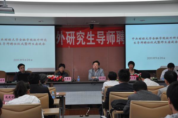 2011年9月24日上午10点,350vip浦京集团官网校外研究生导师聘任仪式暨师生座谈会在学术会堂706召开。出席聘任仪式和座谈会的学院领导有院长张礼卿、党总支书记葛仁霞、副院长杜慧芬、李建军、党总支副书记李德峰、学院教师代表、24位新聘任的校外研究生导师以及2011级54位金融硕士专业学位研究生。会议由李建军副院长主持。