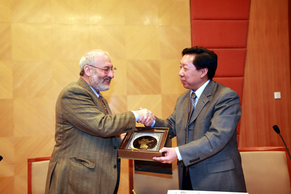 首发式结束后,斯蒂格利茨教授围绕此次出版的文集第一卷的内容,以现代经济理论中的信息经济分析范式为线索向与会的 500多名师生作了一次精彩的学术演讲。在演讲中,斯蒂格利茨教授首先回顾并介绍了他从事信息经济理论研究的由来以及信息问题在现代经济理论研究中的一些重要理论突破,如信息分析在金融市场、医疗保险市场的运用、政府和市场作用等,向大家展示了他眼中的经济学研究“新范式”以及新范式与旧范式之间的区别。随后斯蒂格利茨教授结合他对中国经济的了解以及信息经济分析方法,对中国当前的经济运行及改革发表了一些看法。在他看来,尽管二十多年来,中国社会、经济的发展速度非常快,取得了令世界瞩目的成就,但其本身仍然存在一些问题,目前较为突出的一个问题就是与发达国家尤其是与美国相比,中国的医疗支出仍然非常少,再加上药品营销消耗了大量成本,导致社会保险网相当疲软,社会保障没有覆盖到农村,农民不能享受社会保障的好处。而这又构成了中国高储蓄率的因素之一,使中国过度依赖出口。他建议,中国政府应该在教育和医疗方面继续探索,努力改革。当然,斯蒂格利茨教授也指出,市场经济没有固定的模式,不同的国家需要根据自己的国情来发展本国经济,以适应新的形势。因此,在他看来,中国成功的重要原因在于不断改变策略适应变化的形势。