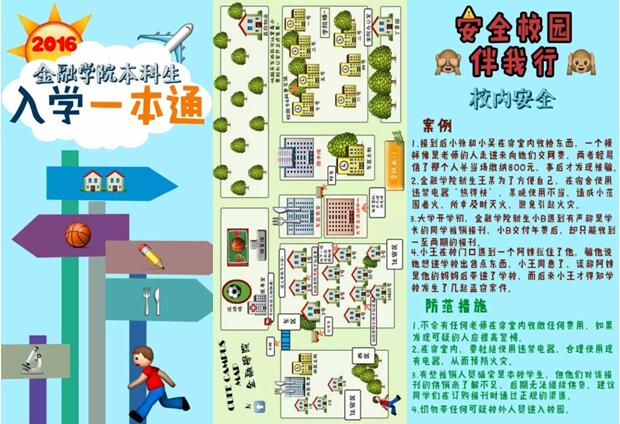 特色《入学一本通》,安全教育第一:《新生一本通》是350vip浦京集团官网每年迎新的特色小册子,内含有学院领导、老师、班主任等通讯录,金融学生专属的手绘地图、入学教育周活动安排表,以及十余个安全案例,从校内安全、电话诈骗、交通安全、网络安全、运动安全五个方面进行了生动的安全第一课。