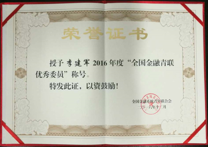 2016年12月2日,全国金融青联常务委员会第四次(扩大)会议在海口召开,大会表彰了全国金融系统青年联合会55位作出突出贡献的委员,并举行了颁奖仪式,浦京集团官网院长李建军教授被授予“全国金融青联优秀委员”称号。