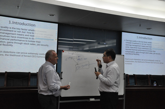 该课程的重头戏是每位学生进行15分钟的研究课题意向展示以及30分钟的讨论。20名学生的研究课题内容丰富,涉及公司金融、家庭金融、股票市场、债券市场、供应链金融、影子银行等方向。除授课老师外,学院的二十多名青年教师也出席聆听了学生的展示,并且与同学们进行了热烈的讨论,以帮助学生厘清研究思路。五天的学习中,课堂气氛热烈,师生交流深入,课程达到了非常良好的教学效果,开启了学生们学术研究的大门。