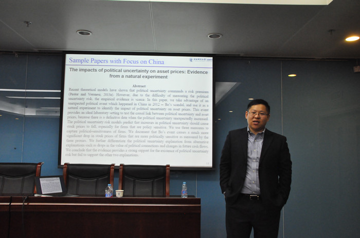 姜富伟副教授向学生们展示了资产定价和公司金融两大研究方向的一些选题范例,以及如何进行文献综述写作、如何收集所需数据进行实证研究。学生们对课程内容意犹未尽,课后仍继续与老师学习讨论。