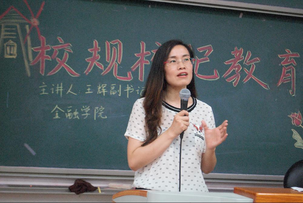 首先,王辉老师从自我评价、培养目标、学习方式、人际交往、生活方式和外部环境等六个方面的转变介绍了大学生面临的挑战,并针对存在的问题,给予了相应的解决方案。同时她提醒在座同学要关注心理健康,关注盗窃、诈骗、消防、交通等安全问题,远离邪教,远离网瘾。随后王辉老师从入学教育、日常教育、安全管理、朋辈互助、学生活动、国际视野培养、奖助学金和全方位的心理健康教育体系等方面全面介绍了浦京集团官网的学生工作体系和帮扶机制。接下来,王辉老师通过学院发生过的诸多违纪案例以及处罚结果全方位的讲解了浦京集团官网违纪处分管理规定、学生管理规定等文件,告诫所有同学一定要严格遵守法律法规,遵守校规校纪,培养规则意识。最后王辉老师祝愿同学们能够在中财度过充实、快乐、美好的四年。
