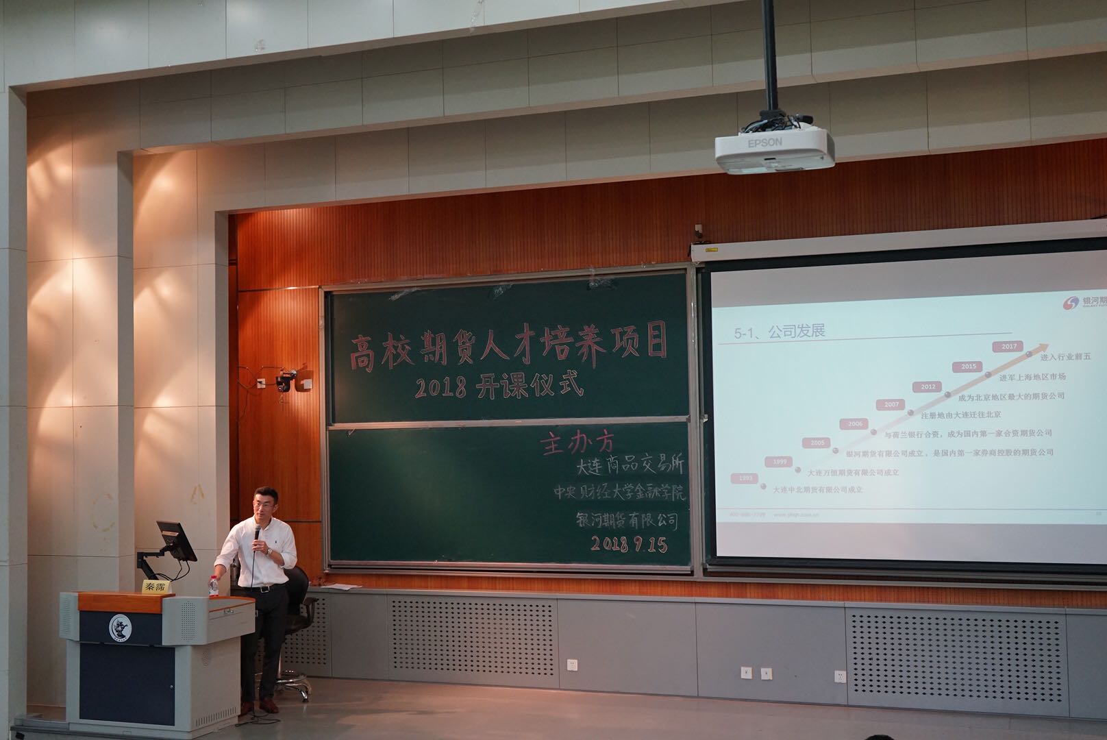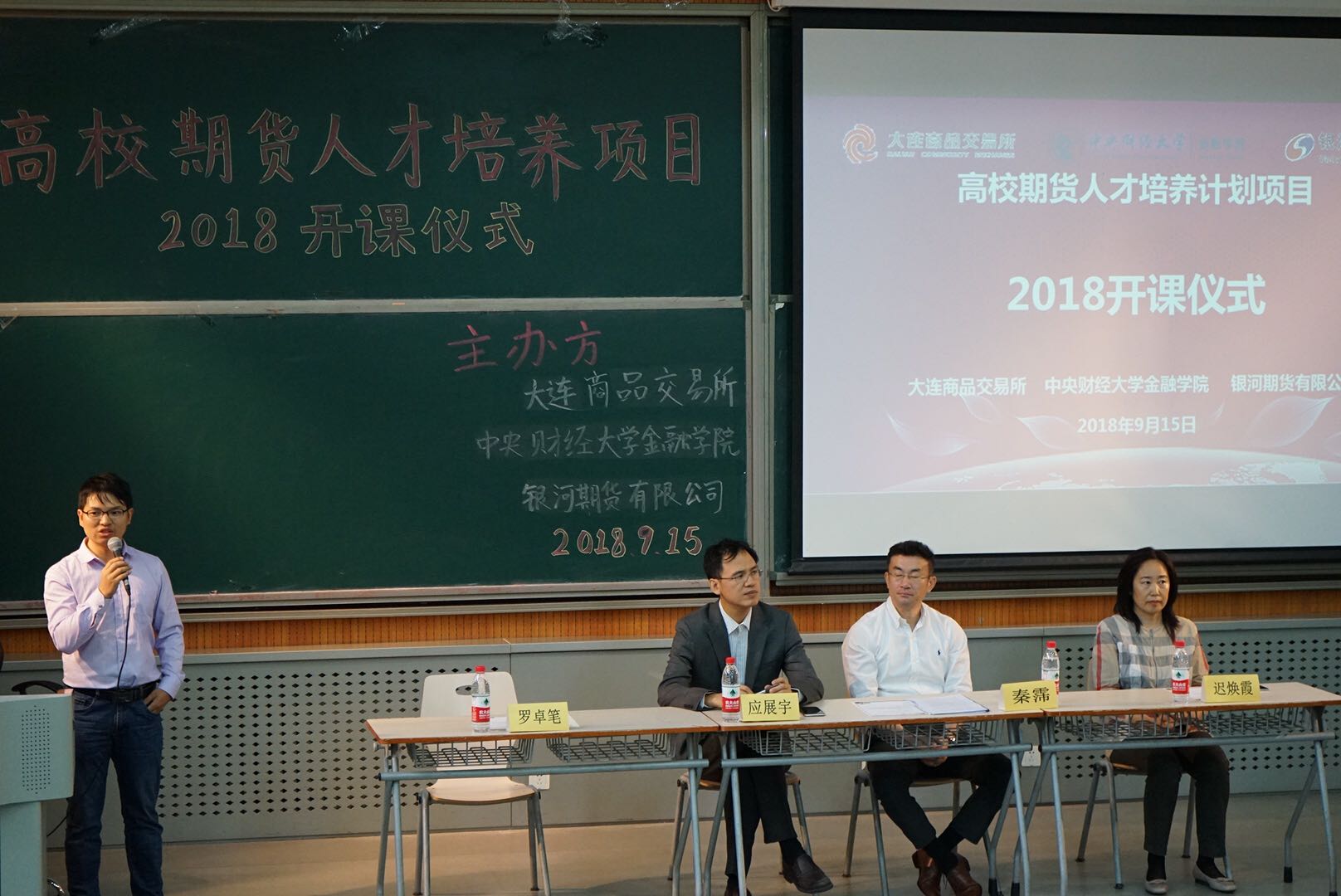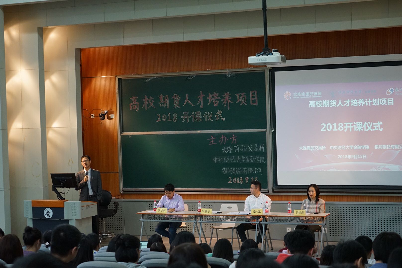 2018年9月15日上午,浦京集团官网与大连商品交易所、银河期货有限公司共同主办的第二期“高校期货人才培育工程项目”开班仪式在沙河校区4号学院楼107报告厅顺利举行。出席仪式的嘉宾有银河期货有限公司副总经理秦霈先生、银河期货有限公司培训部总监迟焕霞女士。350vip浦京集团官网副院长应展宇教授、学院教学科研办公室主任罗卓笔老师以及学院研究生150余名同学参加了开班仪式。仪式由罗卓笔老师主持。
