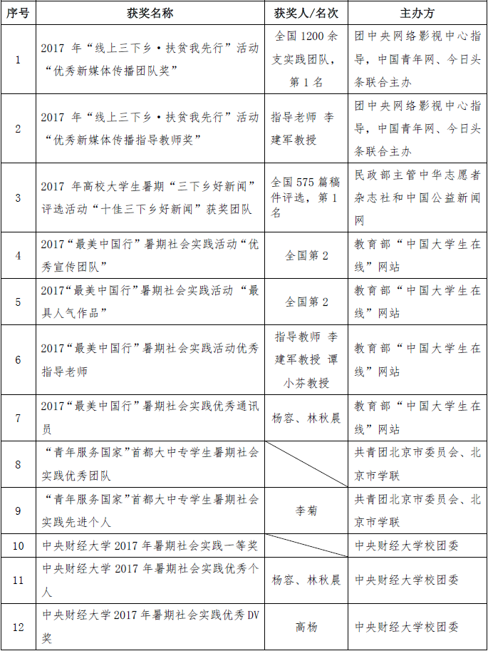2017年10月,浦京集团官网第一届卓越领导人才培养项目实践团队“融川筑梦”暑期社会实践团队分别以全国第2名和全国第8名荣获团中央“最具影响好项目”和“深化改革行知录”两项荣誉。此后捷报频传,“融川筑梦”暑期社会实践团队又陆续获得了国家级、校级12项各类荣誉,具体情况如下表: