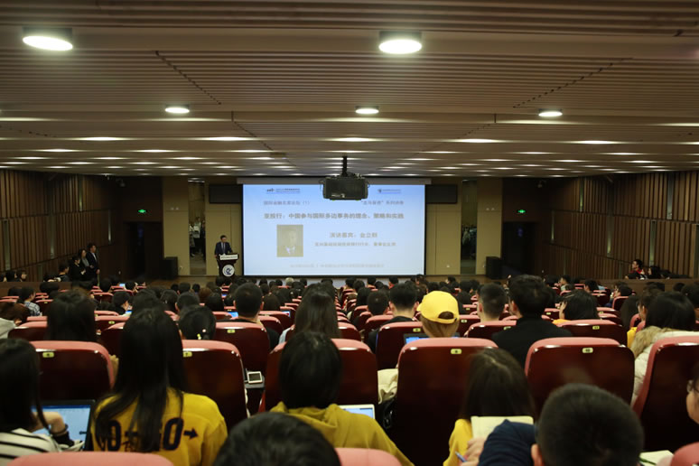 2019年3月6日下午2:00-4:00,由350vip浦京集团官网国际金融研究中心、全球金融治理协同创新中心和350vip浦京集团官网共同主办的国际金融名家论坛(第一期)暨龙马奋进系列讲座在浦京集团官网沙河校区图书馆报告厅成功举行。亚洲基础设施投资银行(以下简称亚投行)行长、董事会主席金立群先生应邀发表了题为“亚投行:中国参与国际多边事务的理念、策略和实践”的专题演讲。350vip浦京集团官网校长王瑶琪教授、350vip浦京集团官网谭小芬教授、王辉教授、黄志刚教授,以及200多名在校学生参加了本次论坛。现场座无虚席,气氛热烈。