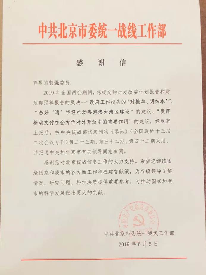 近日,中共北京市委统一战线工作部发来感谢信,祝贺浦京集团官网教授、全国政协委员、全国委员会经济委员会委员贺强在今年两会期间提交的对发改委计划报告和财政部预算报告的反映——“政府工作报告的‘对接单、明细本’”、“念好‘通’字经推动粤港澳大湾区建设”的建议、“发挥移动支付在全方位对外开放中的重要作用”的建议,被中央统战部信息刊物《零讯》采用。