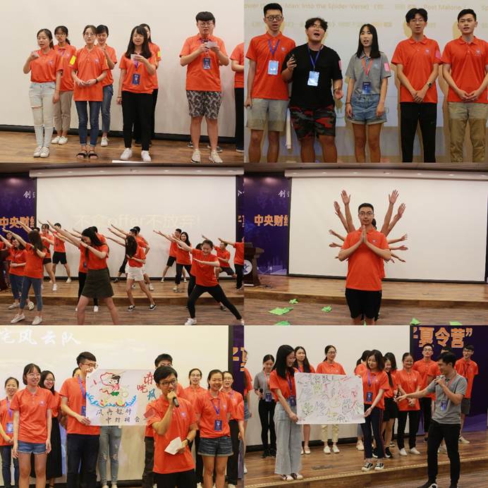 橙队以一首中财版的《成都》唱出了与中财相遇的欣喜和不舍;赤队将话剧《起风了》和歌曲结合,展现了在中财短暂四天内的点点滴滴;一首《那些年》既诉说了对离别的不舍,也暗含着对未来的期许;《燃烧我的夏令营》唱跳表演幽默地调侃了刚结束的高难度专业考核;绿队以《Bang Bang Bang》、《小苹果》等激情的舞蹈串烧将全场的气氛燃到高点;原创音乐剧《青春进行时》充分展现了各位蓝队同学的个性和风采;一首《重返十七岁》展示了紫队同学的“青少年梦”;《我相信》表达出了白队成员对未来的自信和憧憬。