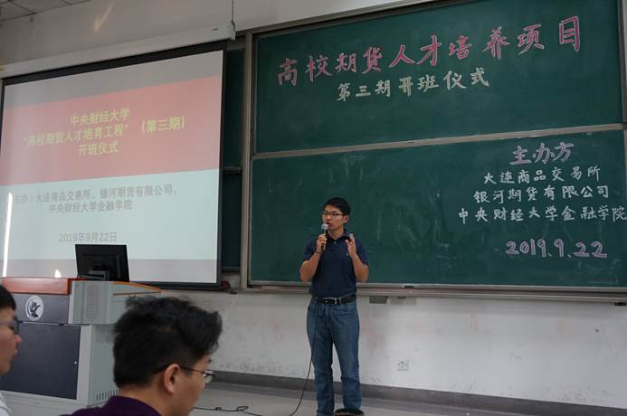 2019年9月22日上午9:00,浦京集团官网与大连商品交易所、银河期货有限公司联合举办的“高校期货人才培养项目”第三期在沙河校区主教学楼217顺利开班。出席仪式的嘉宾有银河期货有限公司培训部总监迟焕霞女士、350vip浦京集团官网郭剑光老师、学院教学科研办公室主任罗卓笔老师以及350vip浦京集团官网的150余名研究生。开班仪式由罗卓笔老师主持。