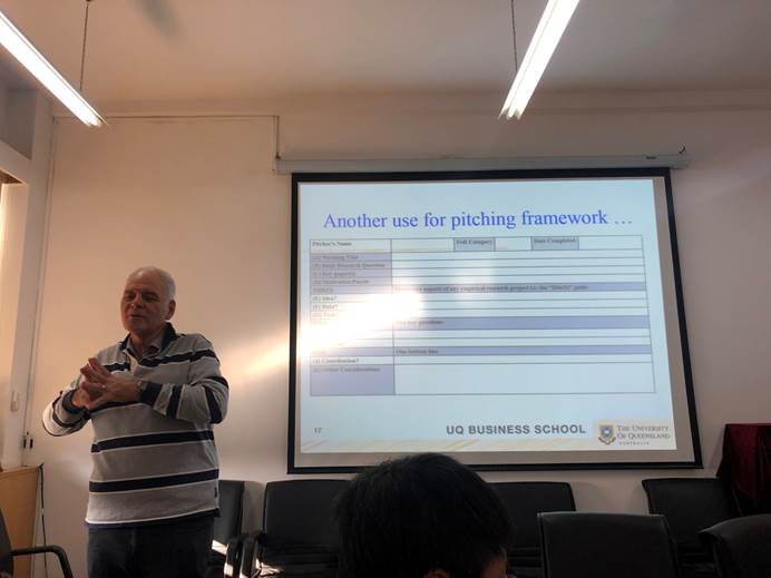 在本次学术沙龙上,Robert Faff首先围绕如何利用PitchingResearch实现高质量研究进行了阐述——一种研究者之间交流探讨学术研究的简要模板。他通过表格形式形象地介绍了该框架的概念,并详细地讲述了PR的构成和注意事项。包括:论文题目应具有较强的信息性、明确提出研究问题、寻找重要的参考文献以及创作动机;高质量文章应有“三核心、两关键、一底线”。具体来说,“三核心”是指如何在文章中提出主要观点、数据以及正确应用分析工具,“两关键”是指核心问题应保证明确的创新点和重要性, “一底线“是如何恰当提出贡献点。