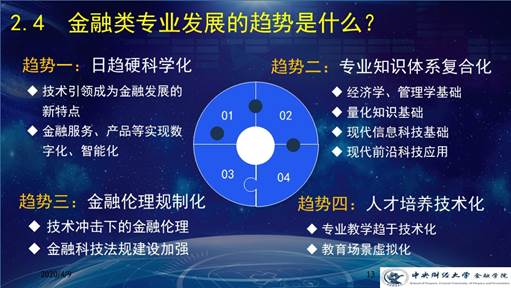 此外他强调了日趋硬科学化、专业知识体系复合化、金融伦理规制化和人才培养技术化的金融类专业发展趋势。