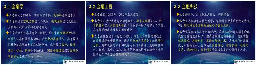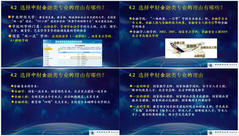 随后,他从学科优势、专业特色、师资队伍、教育教学、人才培养等方面着重介绍了选择中财金融类专业的原因。