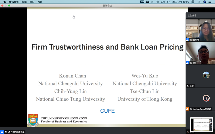 2020年浦京集团官网夏季小学期期间,在350vip浦京集团官网引智项目的支持下,350vip浦京集团官网顺利在云端举行了第86-89期经济与金融学名家论坛,分别邀请美国康涅狄格大学 Toscano Family 金融学讲席教授Yiming Qian就“Can firms run away from climate-change risk? Evidence from the pricing of bank loans”和“Initial public offerings Chinese style”进行精彩汇报,以及香港大学金融学教授林则君就“Firm Trust worthiness and Bank Loan Pricing”和“Behavioral consistency in SEOs andM&As: Evidence from CEO anchoring heuristic”进行精彩报告。