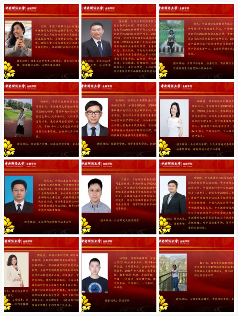 接下来,12位校友导师分享了他们的宝贵的人生经历、从业经验和对同学们的期望,介绍了疫情下金融领域的状况及对同学们职业发展的建议。贡烨校友强调在职业的选择中要明确自身目标、求职方向,然后她对银行中不同类型的工作进行了详细介绍,希望同学们扎实理论基础,在校期间多积累知识;陈培毅校友介绍了大资管时代下要用资源配置的角度看问题,他认为专业是安身立命之本,鼓励同学们在校多读书、开拓视野、关注社会、联系实际、深入思考;杨光校友给同学们提出三点建议,一是探索自己兴趣、树立正确价值观、认识自身能力,二是选择一个大的发展平台,不轻言放弃,三是要有舍有得,学会人生加减法;钟珺弘校友以自身的小故事入手提出了职场六种习惯,即主动融入企业文化、为了对方而写作、会沟通善表达、建立逆商、形象规划、思维突破,她希望同学们具有扎实的文字功底、增强人际沟通能力;岳海峰校友强调了综合素养的重要性,建议同学们大量阅读,读万卷书行万里路,以兴趣助推成长,加强和老师同学的交流,参加公益活动,拓展思维视角;韩桂英校友认为同学们要不断发现自我,寻找职业目标,增强内蓄力,做出终身学习的准备,提高自我管理能力;倪代荣校友介绍了投行的人才需求,并结合自己十多年的资本市场经验,建议同学们在学习的过程中多追问原因,关注事物的合理性;王君正校友分别针对在校期间学习、职业选择、目前资本市场情况三方面进行介绍,强调培养学习能力和认真态度的重要性,他建议同学们利用好寒暑假,在实习中发现自己的职业兴趣;周啸驰校友以欧洲宗教改革的故事、京东白条ABS等具体案例讲述金融科技的发展和应用,鼓励同学们增强自身能力,勇敢面对未来挑战;周冠南校友建议同学们珍惜实习机会,在实习中多学、多听、多问、多思考,了解行业、部门的实际情况,关注资本市场近期动态;杨明鑫校友详细介绍咨询业的发展、工作价值、人才需求,以切身经历向同学们讲述了咨询职业的发展路径、成为咨询从业者的方法等,建议同学们培养独立思考的能力,积极主动的精神,认真工作的态度;拓小燕校友深刻剖析了自己的职业生涯,鼓励同学们提升理论素养和专业技能,深度阅读经典著作,关注行业的发展,更要做靠谱踏实的人,开阔自身的格局与胸怀。