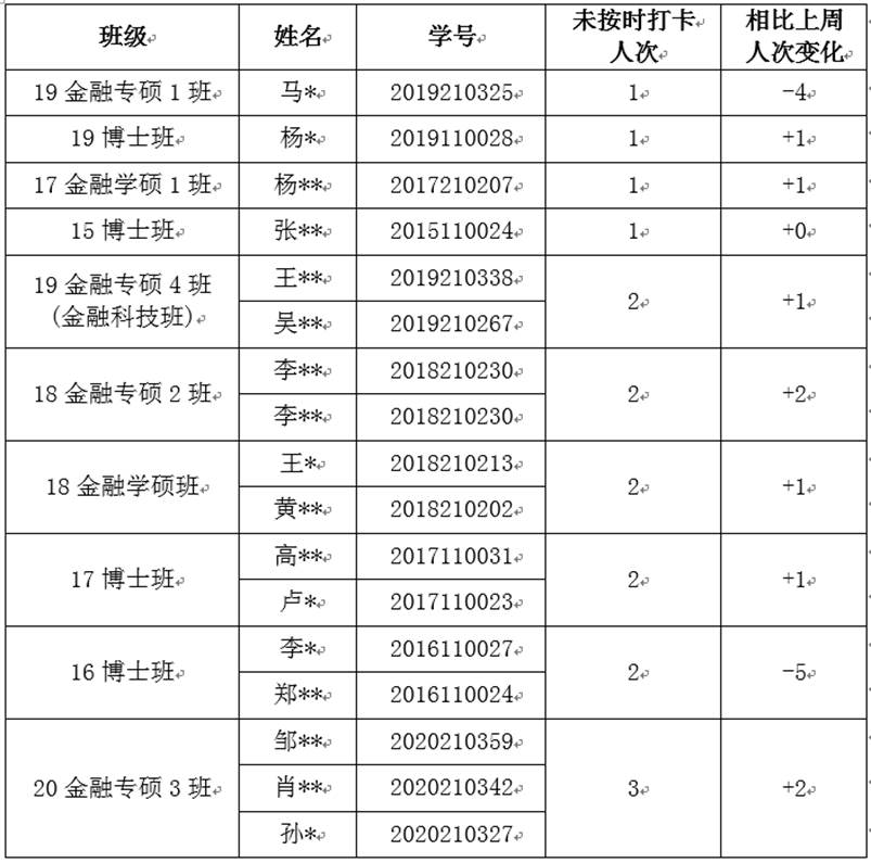新冠肺炎疫情防控阻击战尚未结束,零星地区出现散发病例,疫情防控形势仍然严峻。实施疫情防控常态化,做到严防严控不松懈,是350vip浦京集团官网每名研究生的责任和义务。为更好地督促同学们坚持每天按时打卡,学院每周通报各班延迟填写疫情防控信息同学名单。本周41人次未按时打卡,名单通报如下:
