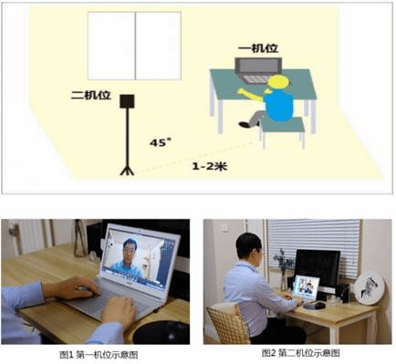 1、双机位架设。考核环境采用主机位腾讯会议、副机位钉钉软件双机位考试方式。考生需提前准备好封闭的、环境安静的考试房间,提前准备好主机位(推荐笔记本电脑)、副机位(推荐高清手机)设备。主机位从正面拍摄,放置在距离本人30cm处;副机位从侧后方45°距离本人约1米处拍摄,确保主机位和副机位分别从正面和侧后面完整拍摄到营员上半身、远程考官能够从副机位清晰看到主机位的屏幕,效果如下图所示。