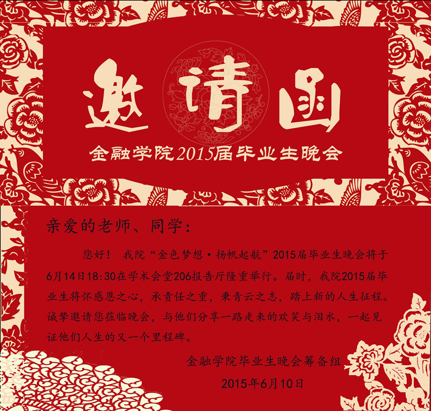 浦京集团官网“金色梦想•扬帆起航”2015届毕业生晚会将于6月14日18:30在学术会堂206报告厅隆重举行。届时,浦京集团官网2015届毕业生将怀感恩之心,承责任之重,秉青云之志,踏上新的人生征程。