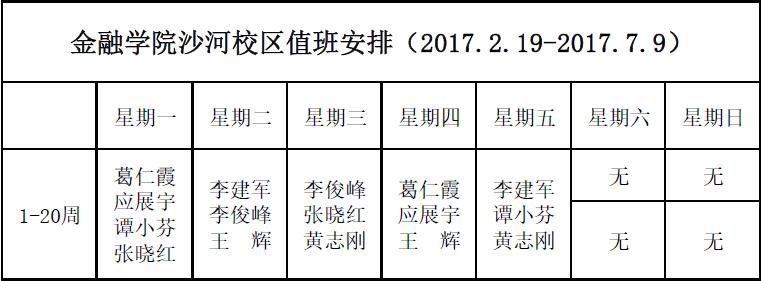 350vip浦京集团官网沙河校区值班安排(2017.2.19-2017.7.9)