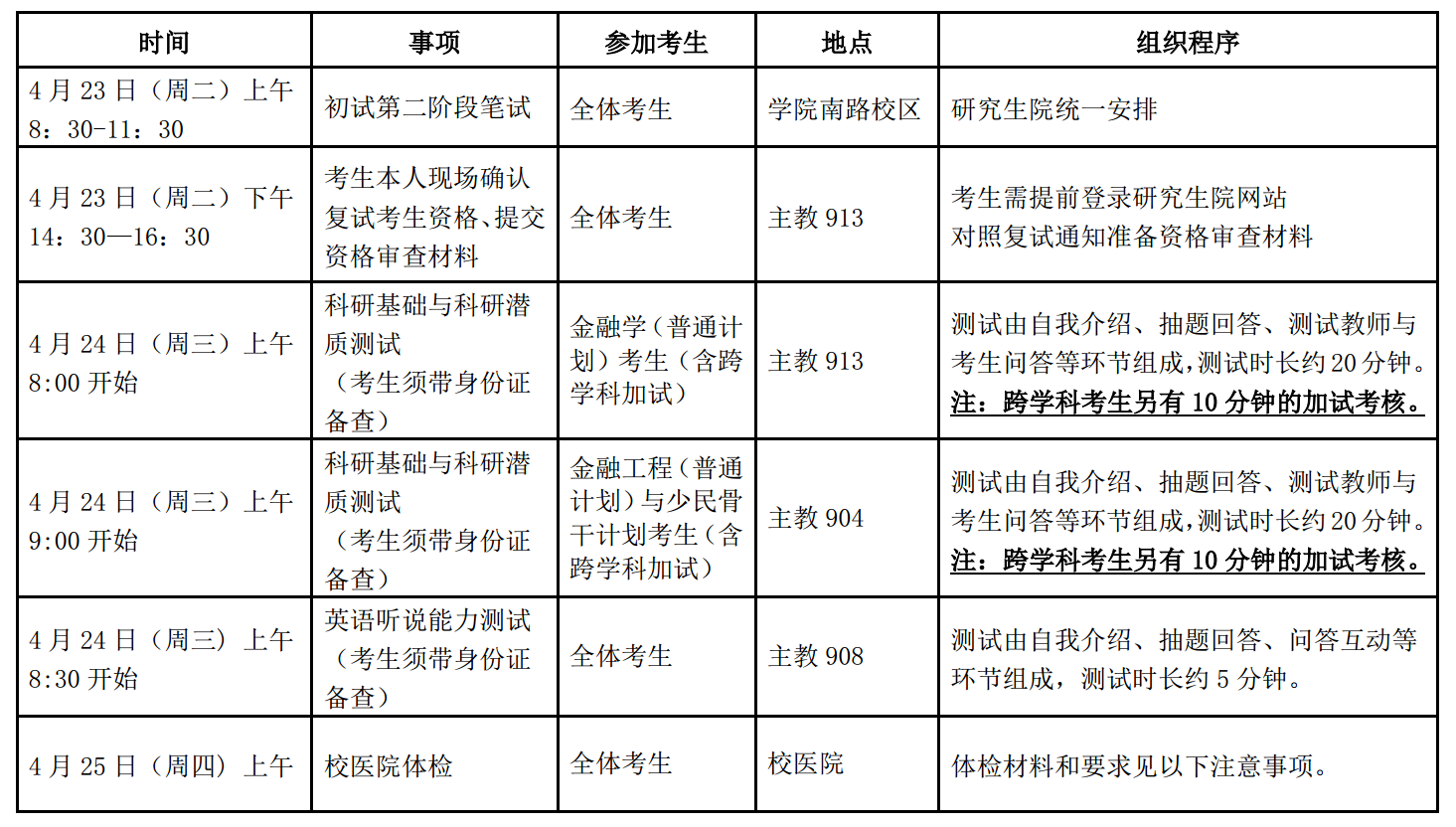 2.校医院体检:4月25日上午为学校统一安排体检时间,考生须参加统一体检。体检前请自行打印体检表(正反面打印),贴上照片,并填写好报考单位(即报考学院)、报考专业、 复试编号(请填写研招网下载的准考证号)和既往病史四项内容。体检当天晨起空腹,并备好体检费53元零钱。