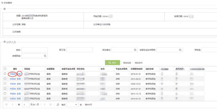 (3)查看公示人员列表,并可通过点击“申报表”或“查看按钮”查看申报人员详细信息。