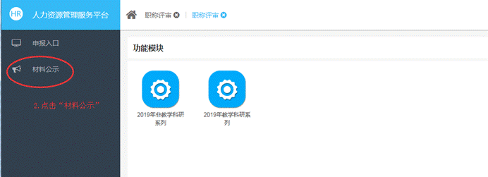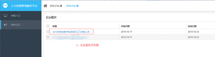 (2)点击左侧“材料公示”条目,再点击蓝色的公示标题;