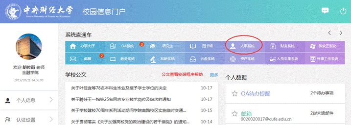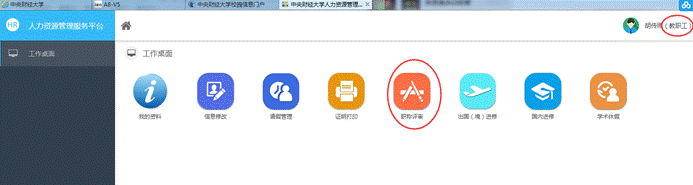 (1)个人登录校园门户系统后,从校园门户-人事系统跳转,或用校园门户密码直接登陆zhicheng.cufe.edu.cn(注意:右上角角色须为“教职工”),然后点击“职称评审”;