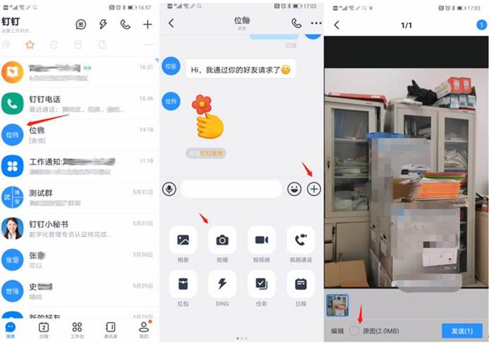 ,接着点“拍摄”,对“手写的答卷”进行拍摄(确保拍摄图片清楚,答题笔迹清晰可辨认),拍摄后点选“原图”,然后将图片发送给监考老师。监考老师接收图片后,检查所拍摄答卷图片,并跟考生确认交卷完成。考生操作主要步骤如下图所示: