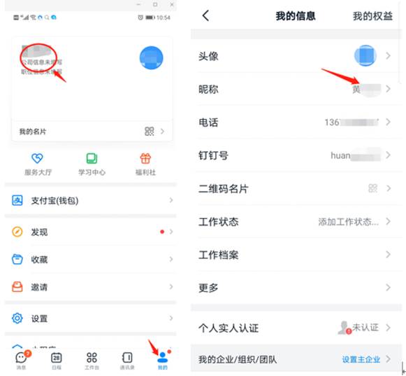2.笔试前半小时,考生将收到监考老师发来的腾讯会议ID号。考生在主机位打开腾讯会议,选择加入会议,输入会议ID和个人真实姓名,然后点击加入会议按钮;接着操作副机位,加入监考老师发起的钉钉视频会议时,要求使用真实姓名,具体听监考老师指令。钉钉软件修改姓名操如下图所示: