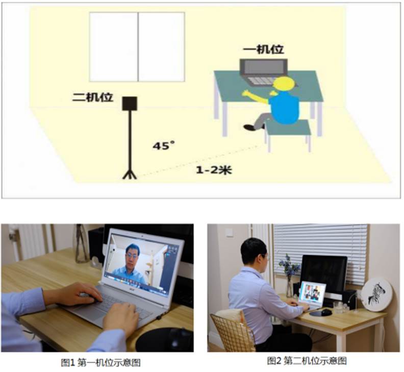 1、双机位架设。考核环境采用主机位腾讯会议、副机位钉钉软件双机位考试方式。考生需提前准备好封闭的、环境安静的考试房间,提前准备好主机位(推荐笔记本电脑)、副机位(推荐高清手机)设备。主机位从正面拍摄,放置在距离本人30cm处;副机位从侧后方45°距离本人约1米处拍摄,确保主机位和副机位分别从正面和侧后面完整拍摄到营员上半身、远程考官能够从副机位清晰看到主机位的屏幕,效果如下图所示。
