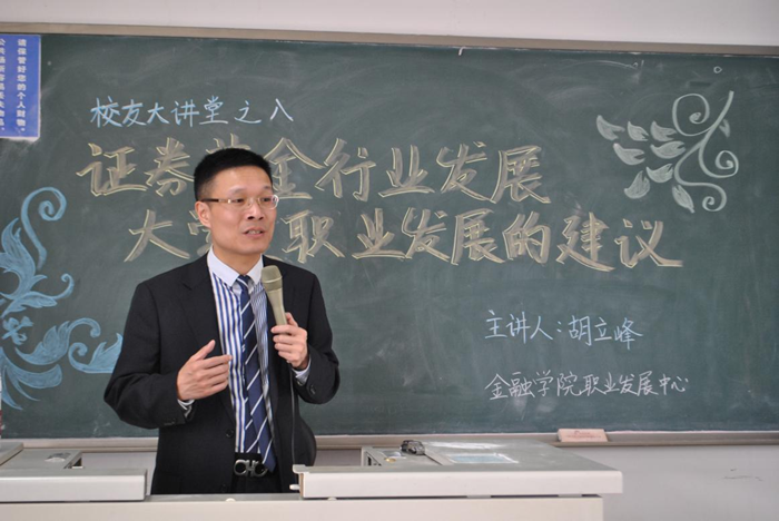 4月5日,350vip浦京集团官网邀请金融学1990级校友,中财北京校友会金融分会副会长,中国银河证券基金研究中心总经理胡立峰,在沙河校区东区主教505教室为同学们举办了一场题为“资本市场发展前景与职业规划”的讲座。