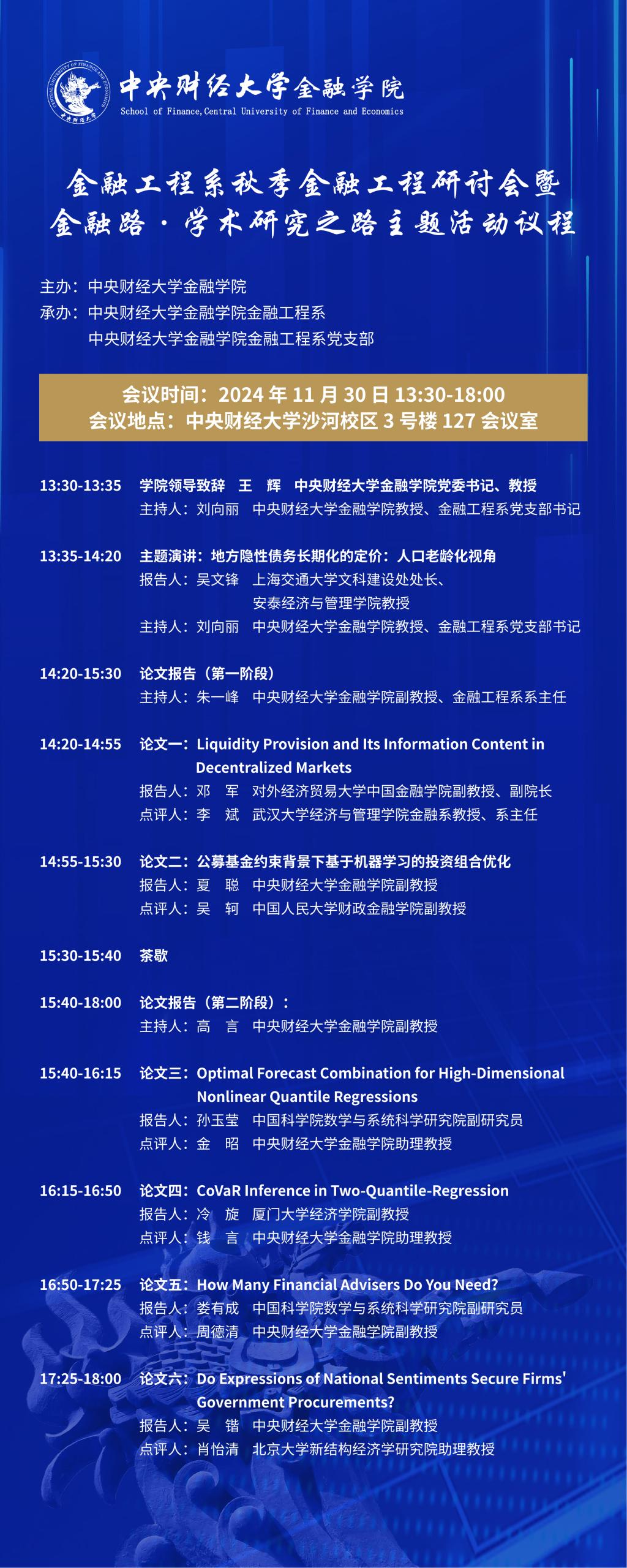 金融工程系秋季金融工程研讨会暨金融路·学术研究之路主题活动议程