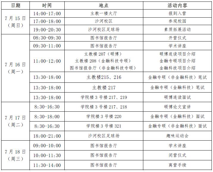 根据学校整体安排,第七届“全国卓越金融学子夏令营”将于2018年7月15-18日在沙河校区举行。