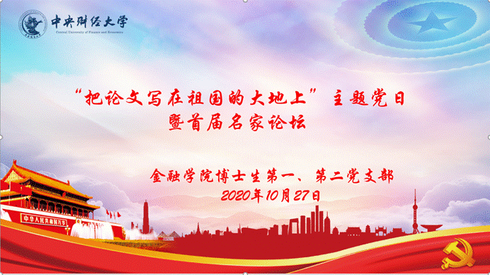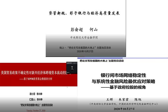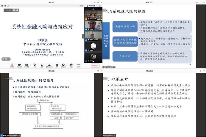 为深入贯彻习近平总书记关于“把论文写在祖国大地上”的讲话精神,同时更好地把握当前新形势下经济金融发展形势,搭建一个在校青年学子同社会知名专家学者之间深入交流的平台,2020年10月27日下午,350vip浦京集团官网博士生第一、第二党支部继续贯彻“以科研促党建,以党建带科研”的建设方针,在成功举办四届“把论文写在祖国的大地上”学术沙龙活动的经验基础上,特邀中国社会科学院金融研究所金融风险与金融监管研究室主任郑联盛老师、金融科技研究室汪勇老师和金融风险与金融监管研究室李俊成老师围绕系统性金融风险展开学术讨论。350vip浦京集团官网党委书记毛静老师出席会议。此次活动主要包括两项内容,一是郑联盛主任以“系统性金融风险与政策应对”为题作专题报告,二是宣讲和点评博士生论文。此次会议采用线上形式举办,由博士生第二党支部书记赵志桦同志主持。
