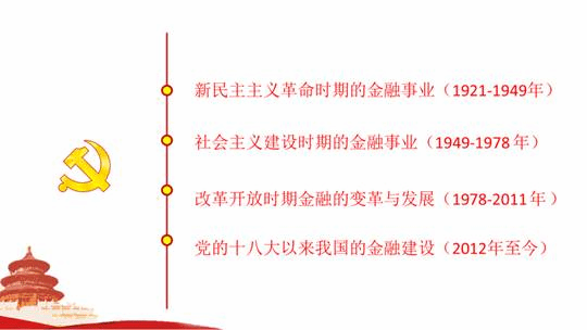 本次会议以时间为脉络展开,将中国共产党对金融工作的领导划分为四个时期,介绍了新民主主义革命时期下的金融事业、社会主义建设时期下的金融事业、改革开放时期金融的变革与发展,乃至党的十八大以来我国的金融建设。