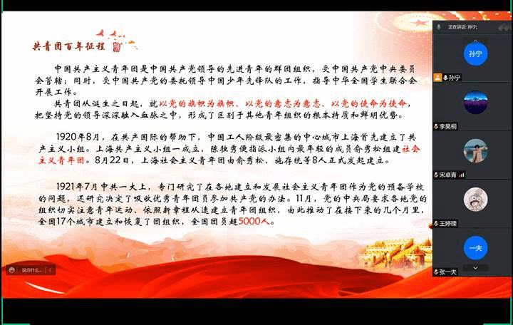 研究生党员孙宁引出对共青团百年征程的思考。本次会议通过讲解和视频的形式,重温了共青团成立的背景以及共青团如何党的带领下,为实现中华民族伟大复兴中国梦作出的重大贡献。