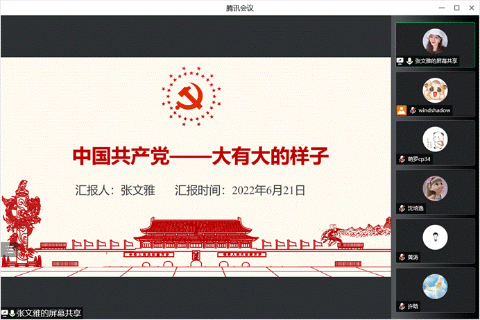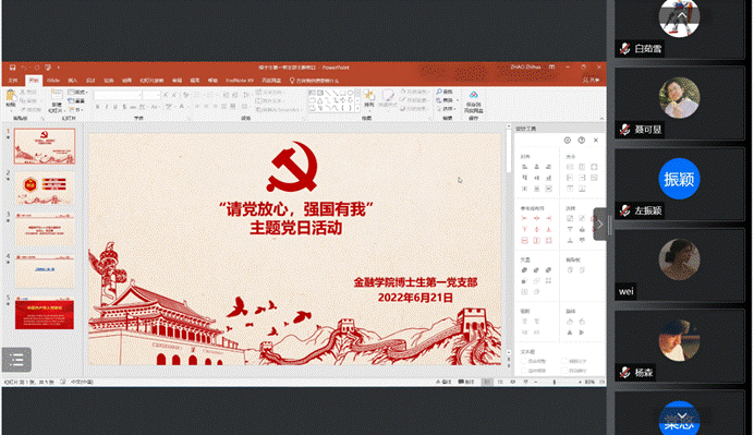 为深化党史学习教育,引导广大毕业研究生党员发扬红色传统,传承红色基因,赓续红色血脉,增强“四个意识”,坚定“四个自信”,做到“两个维护”,博士生第一党支部于2022年6月21日晚上7:30召开“请党放心,强国有我”主题党日学习活动。会议由支部书记赵志桦同志主持,34名党员参加学习,博士生宣讲团成员、350vip浦京集团官网博士生第二党支部宣传委员张文雅同志出席会议并做党课分享。
