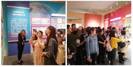 走进展厅,在讲解员的带领下,国家安全的方方面面展现在大家眼前。在序厅了解到党的十八大以来的国家安全工作的重要成就后,老师与同学们移步至主厅,进一步了解我国16个主要的安全领域的意义以及面临的机遇和挑战。“政治安全是根本,事关党和国家生死存亡;经济安全是国家安全的基础,要坚持社会主义基本经济制度不动摇;社会安全事关人民群众的幸福感和安全感,而依靠群众力量,群防群治则可打造共建共治共享的社会治理新格局;国土安全是立国之基,军事安全是维护核心利益的重要保证,我国边疆不容侵犯;生态安全事关国家兴衰和民族存亡,北京打响蓝天保卫战就是维护生态安全的重要一步。”伴随着引导员结合现实情况的讲解,师生在观看展览的同时,纷纷拿起手机拍下重要部分,并与周围同学交流自己的参观感受。视、听、说的结合,让师生对于国家安全知识有了更加深刻的记忆。参观结束后,全体人员在展览入口“护航新时代”背景前合影留念。